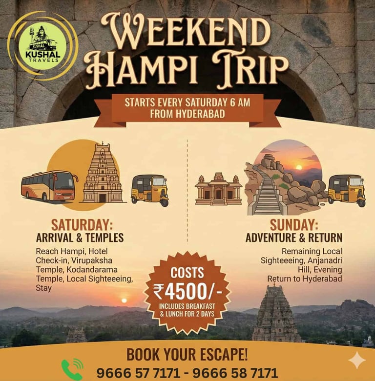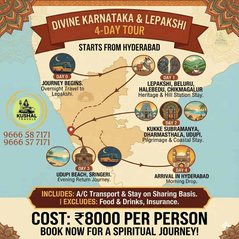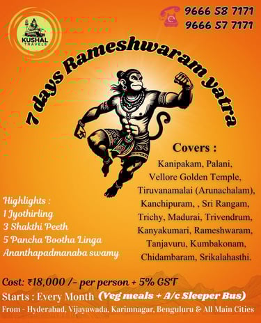 At Kushal Travels, we turn every journey into a soulful experience. Based in Siddipet & Hyderabad, we specialize in organizing devotional road trips and pilgrimage tours across India β blending spiritual exploration with modern comfort.